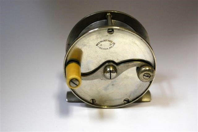 Wm. H. Talbot Reel Co. - Nevada, Mo. Marked German Silver and Aluminum Ben Hur Fly Reel This example, a size 101, has a dia. of 2 1/2" and a 1" wide spool. The subject of a January 22nd, 1901 patent, the shouldered pillars featured on this reel provided more support for the frame and extended to the outer face of the side plate.